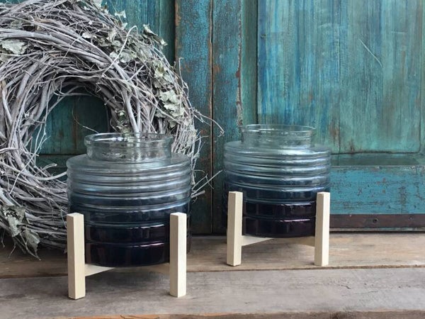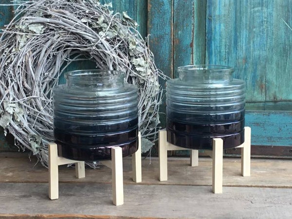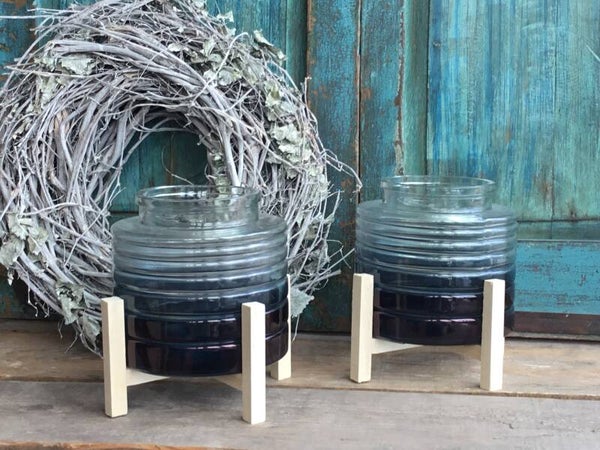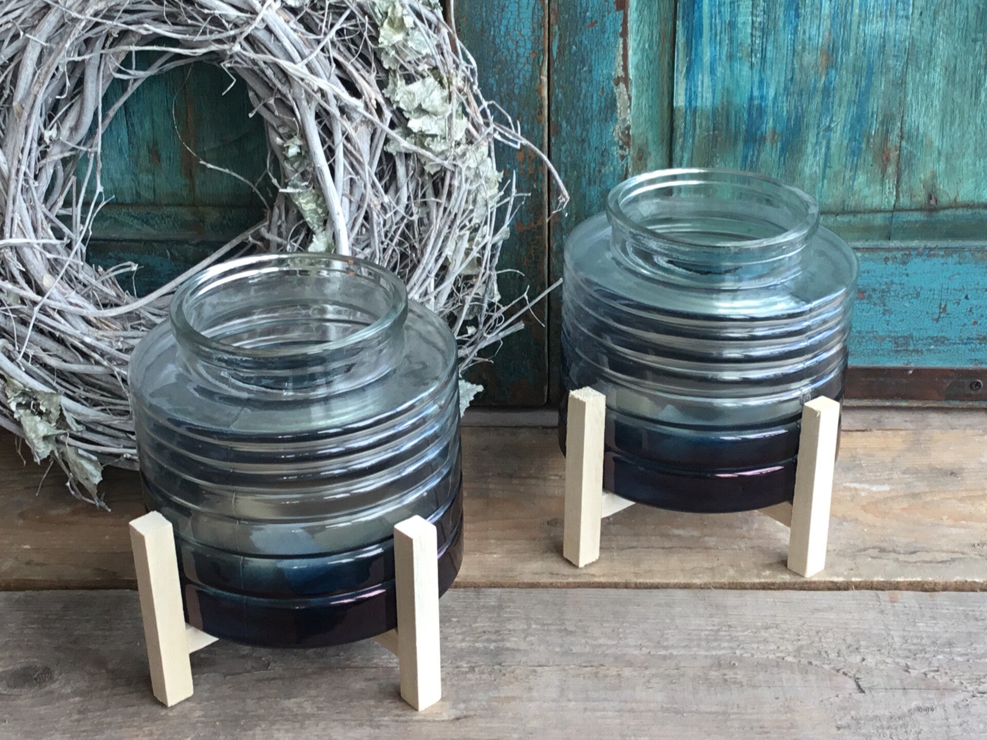 Windlicht op houten pootjes blauw glas .