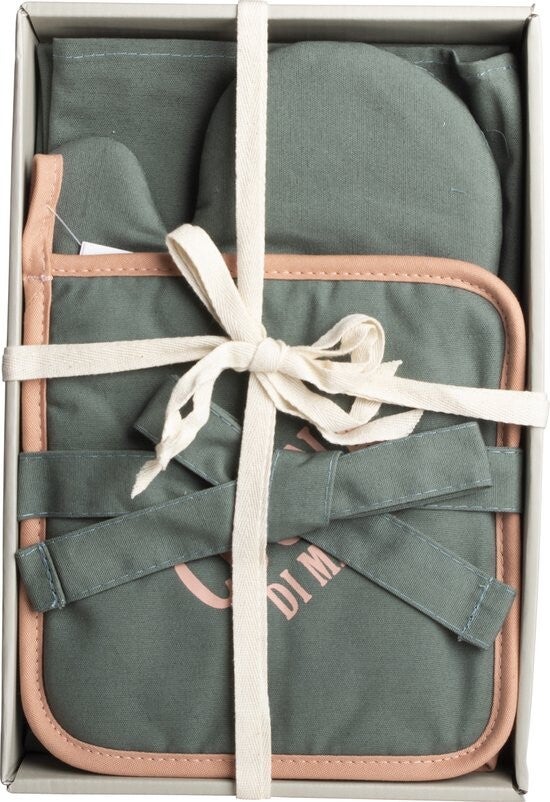 De set bestaat uit een keukenschort, pannenlap en ovenwant, gemaakt van stevig katoen in een diepe groene kleur met subtiele roségouden accenten.