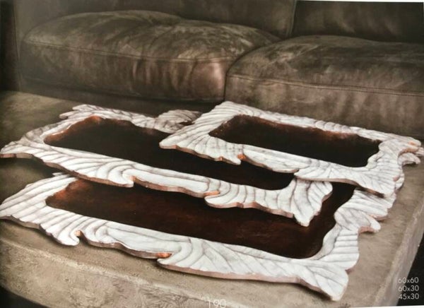 Dit prachtige houten dienblad van PTMD is een echte blikvanger in jouw interieur. Het robuuste hout en de organische vormen zorgen voor een natuurlijke, warme uitstraling. Het blad is rijk gedetailleerd met een reliëf dat doet denken aan bladeren, wat het een unieke en stijlvolle look geeft.