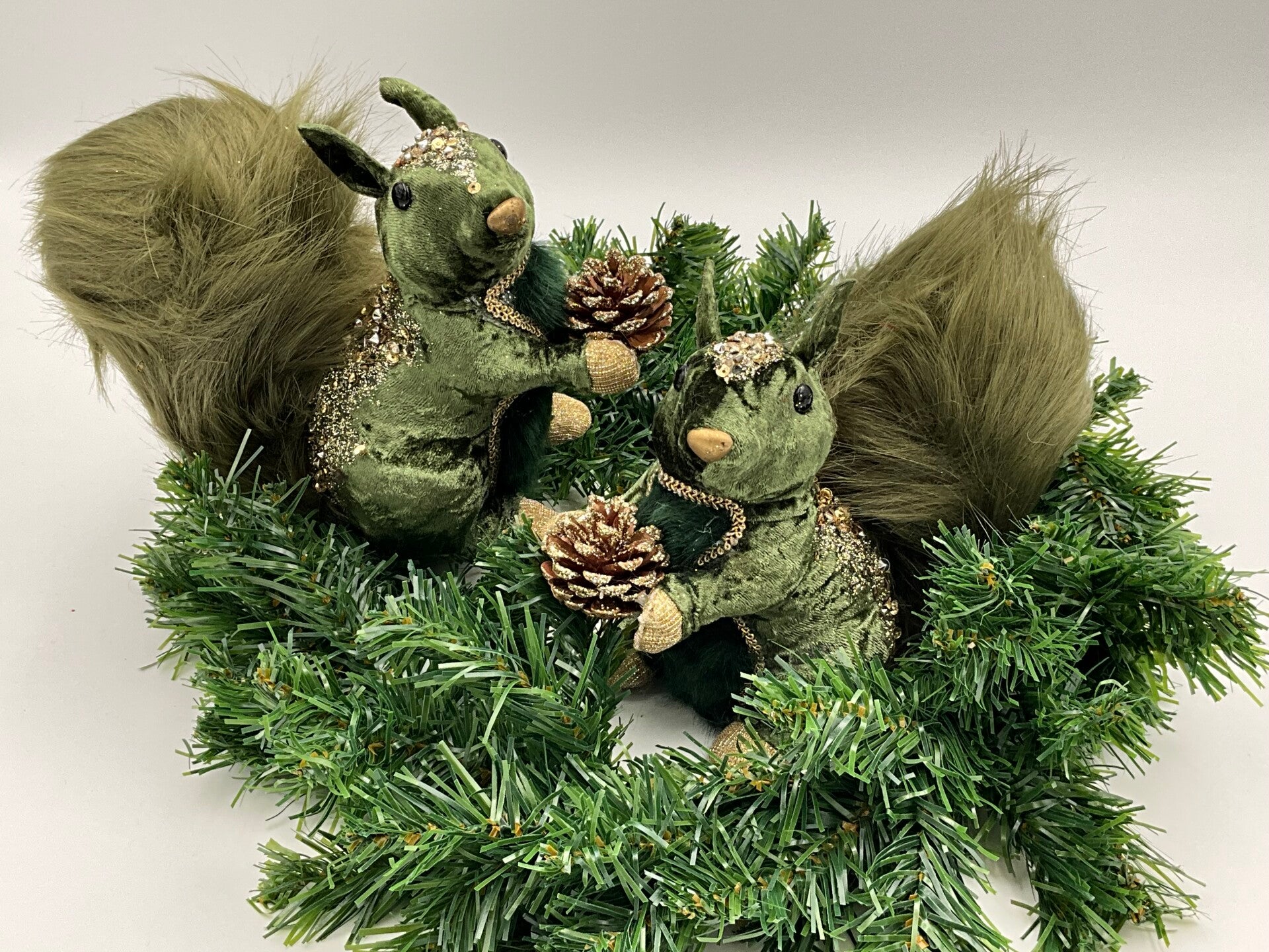 deze exclusieve decoratieve kersteekhoorns. De diepe groene kleur, glinsterende details en zachte, volle staart maken deze set een echte blikvanger in elk interieur.