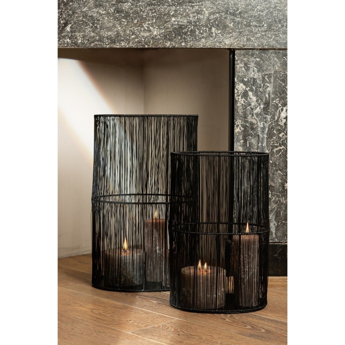 PTMD windlichten set van 3. De slanke, opengewerkte structuur zorgt voor een prachtig spel van licht en schaduw wanneer de kaarsen branden. De diepe zwarte kleur geeft de windlichten een moderne en luxe uitstraling.
