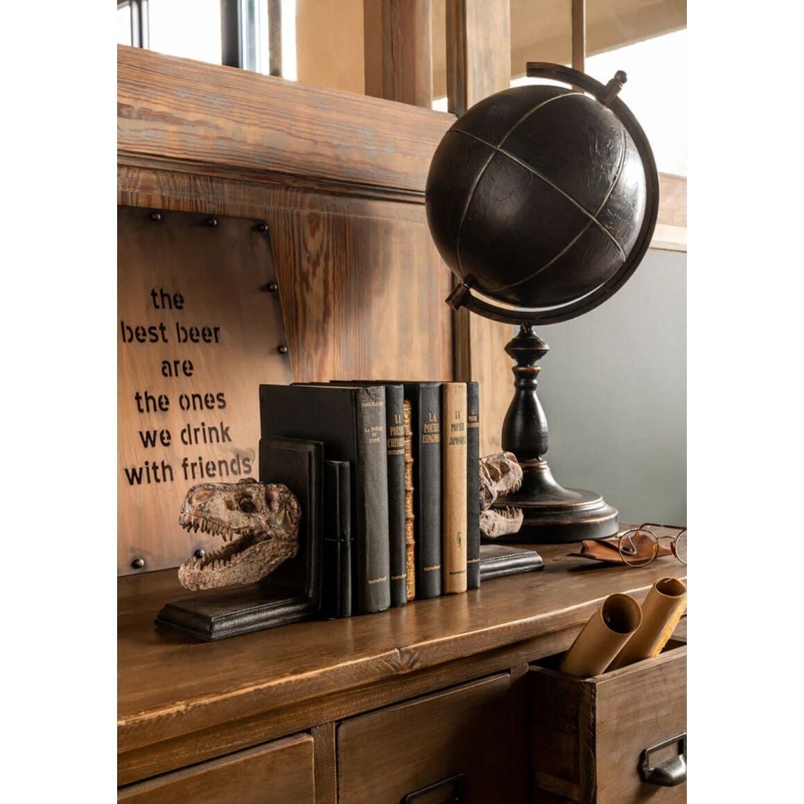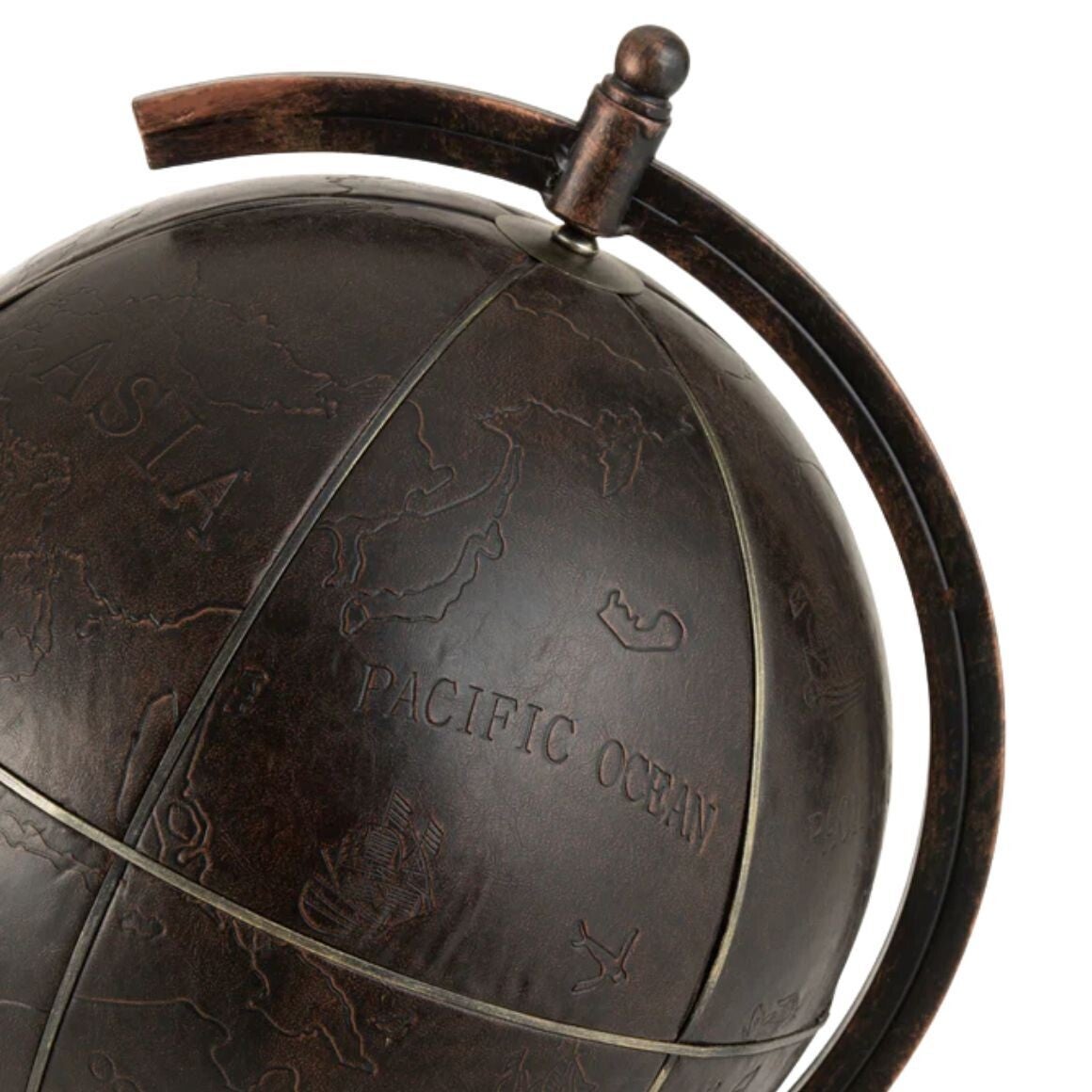 De wereldbol is vervaardigd uit imitatieleer, wat zorgt voor een luxe en warme uitstraling. De donkere tinten en subtiele reliëfdetails geven het geheel een authentiek karakter. Dankzij de elegante voet en het metalen frame staat deze wereldbol prachtig op een bureau, kast, sidetable of in een boekenkast.
