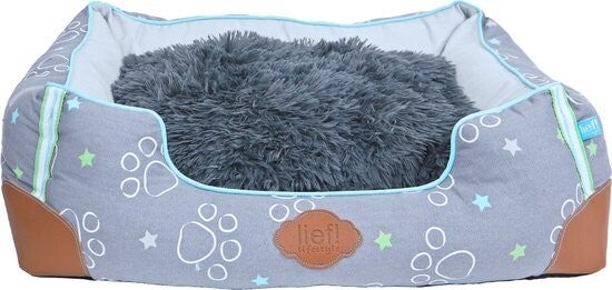 Deze dierenmand uit de Divan-serie van Lief! is perfect voor honden of katten die graag comfortabel liggen. De mand heeft een moderne en vrolijke uitstraling, met een combinatie van grijs en blauwe accenten en stoere bruine leren hoeken. Het zachte binnenkussen van grijs pluche zorgt ervoor dat je huisdier helemaal tot rust komt. Gemaakt van een mix van polyester en katoen, met een uitneembaar kussen dat wasbaar is tot 30 graden.